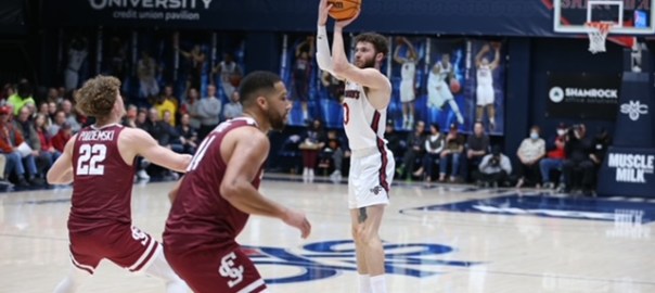 Aidan Mahaney, shown above in a game from last season, led all scorers with 25 points against New Mexico, sinking 5-10 three-point attempts. Photo courtesy of Tod Fierner.