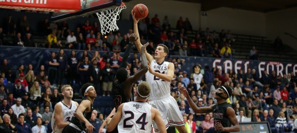 Evan Fitzner, now a substitute instead of a starter as he was in the photo above from an earlier game, has won playing time in recent games by providing stout defense — as he demonstrated in the Gaels’ 65-62 win over San Diego. Photo courtesy of Tod Fierner.