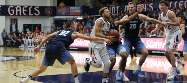 Despite constant harassment by LSU guard Skylar Mays, Jordan Ford, pictured above from last season against San Diego, managed to score 21 points in the Gaels’ losing effort against the Tigers. Photo courtesy of Tod Fierner.
