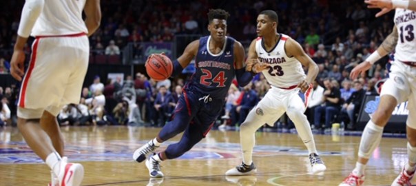 Malik Fitts, shown above with longer hair driving against Gonzaga last season, recorded a double-double against Winthrop with 18 points and 13 rebounds, but it was not enough to lead the Gaels to victory. Photo courtesy of Tod Fierner.