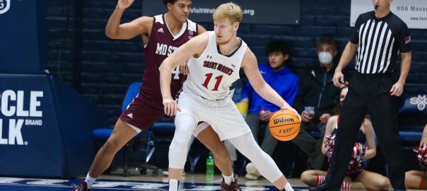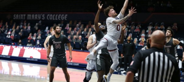 A few minutes later, Bowen picked up Scott as Scott tried to bull his way through the paint for a lay-up. It was not a decision to be taken lightly, as Scott can be fearsome to defend when he has the basket in sight. Nevertheless, Bowen stayed in front of Scott, and drew a charging call that kept LMU from shrinking a 62-56 lead. To cement the win, Ducas then sank his fifth three-pointer to give Saint Mary’s a comfortable lead at 67-56 with 1:42 left.
